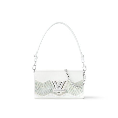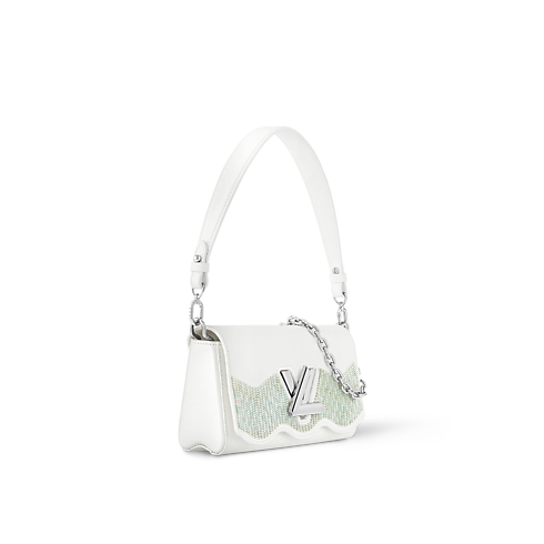 This Twist West handbag looks stunning in calfskin, with sea-green beads sewn on the flap. The bag’s elongated shape brings elegance while the silver-color chain and LV Twist lock perfectly complement the shimmering beads. A removable shoulder strap, and a decorative chain that can be attached to the strap, allow for several carry options.