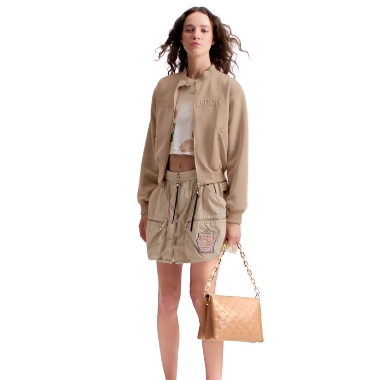 Utility detailing elevates this mini skirt into a sporty statement. It is cut from lightweight peach-effect cotton in a casual A-line shape, while an exposed zipper trimmed with a Monogram canvas pull and two oversized fastened pockets add volume and structure to the front. A vibrant Louis Vuitton travel patch completes the look with a seasonal signature.