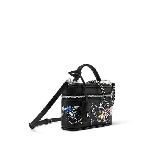 The Eden collection presents this glamorous iteration of the Vanity Chain Pouch, defined by exquisite embroidery. Adorned with multicolor gems and rhinestones, it is crafted from calfskin in a classic Black colorway and includes a braided gold-toned chain, which can be removed if desired. The leather address tag pays tribute to the House’s iconic travel heritage and savoir-faire.