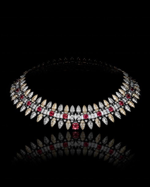Conquest ignites the heroine’s journey in a bright spark of white and yellow gold arrows — embodying destiny, purpose, and direction through majestic symbolism. A striking necklace set with 21 vivid red rubies totaling 21.86 carats is outlined in onyx — crowned with a central ruby and a 1.07-carat LV Monogram Star cut diamond.
