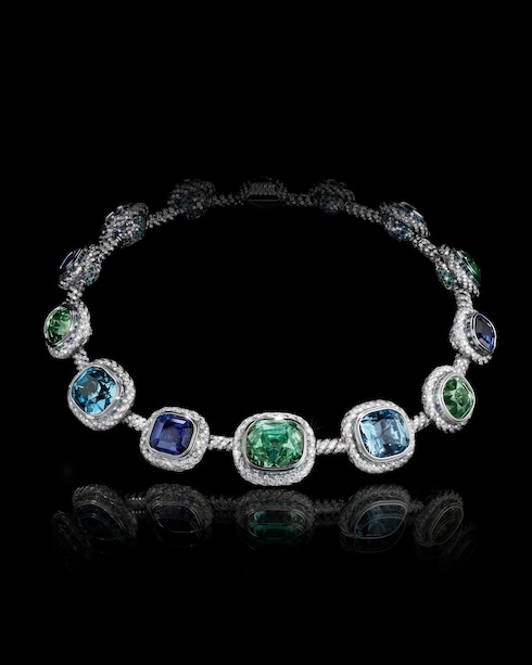 Guided by Sirius, the evening star, this theme captures the serenity of a starlit sky and the protective aura of mythic dieties. A constellation of 13 gemstones — tourmalines, aquamarines, and tanzanites totaling 249.31 carats — unfolds along a diamond rope, while exceptional inverse settings shimmer in pavé-set emeralds, sapphires, Paraiba tourmalines and LV Monogram stars.
