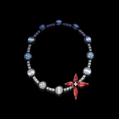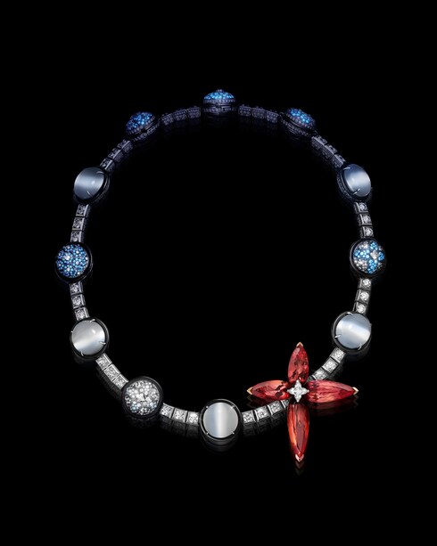 Conjuring a realm of mysticism, Spell reveals a hidden universe and its secrets in the dark — evoking the heroine's inner light. A marvel of innovation, a necklace of dazzling fluorescent diamonds glows in the dark to unveil a spellbinding pattern, complemented by 65.97 carats of Cat’s Eye moonstones and 44.13 carats of orange-pink topazes — amplified by four LV Monogram Star cut diamonds.