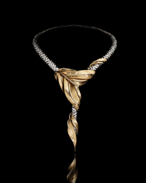 Triumph embodies resilience and rebirth — the final challenge of self-creation. Hand-engraved gold wings with sablé and brilliant finishes unfold in a long necklace subtly forming the signature V of Vuitton, where yellow gold wraps around white gold rope, pavé-set with 1,350 diamonds in a luminous interplay of light.