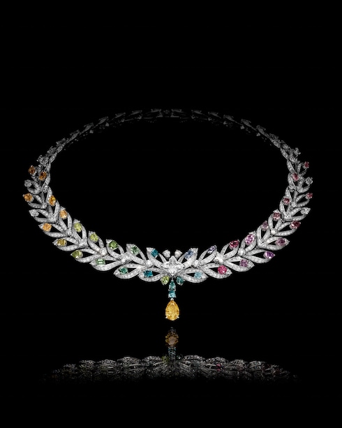 A pinnacle in a blaze of light and color, Victory celebrates an extraordinary journey through laurel crown-inspired designs. The necklace set with a rainbow gradient of 38 colored diamonds totaling 19.71 carats, accented by a 3-carat Fancy Vivid orange-yellow pear cut diamond and a 3.88-carat LV Monogram Star cut diamond. Echoing the necklace’s brilliance is the most exceptional ring of Louis Vuitton's High Jewelry, featuring a 3.31-carat Fancy Vivid pink pear cut diamond, a 1.01-carat Fancy Intense green diamond, and a 2.08-carat LV Monogram Star cut diamond — marking the apex of the collection.