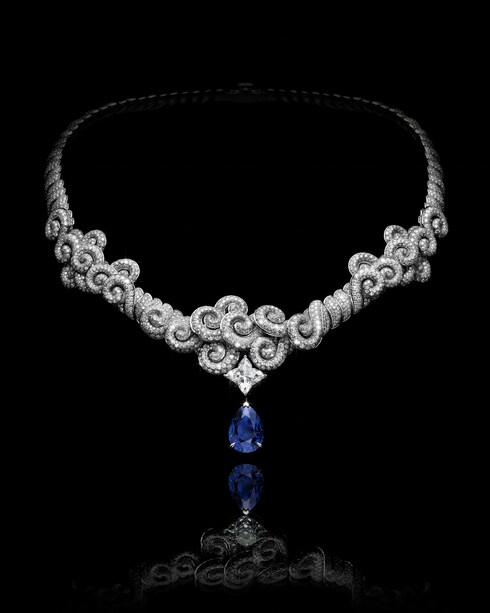 A delicate invocation of air and light, Whisper guides the heroine through dreams — a breath of wisdom and serene grace. White gold pavé volutes rest lightly on the neck, punctuated by an 11.56-carat royal blue sapphire and a 4.11-carat D Flawless LV Monogram Star cut diamond, in a transformable creation of soft elegance.